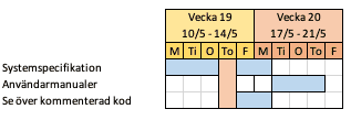 För att projektets arbete ska vara spårbart och repeterbart behövs dokumentation. Denna dokumentation kommer dels att bestå av kommentarer i befintlig kod men samt av en rad dokument. Dessa dokument kommer utformas som manualer för att vara behjälplig att repetera projektet vid behov och felsökning.
